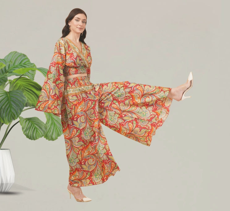 Product Details: This super chic Bell Sleeve top & Wide Legged Pant Co-Ord set offers a seamless blend of sophisticated style and convenience, making it a must-have for modern wardrobes. This Boho Goddess outfit made of luxe fabric gives an exquisite soft feel and effortless...