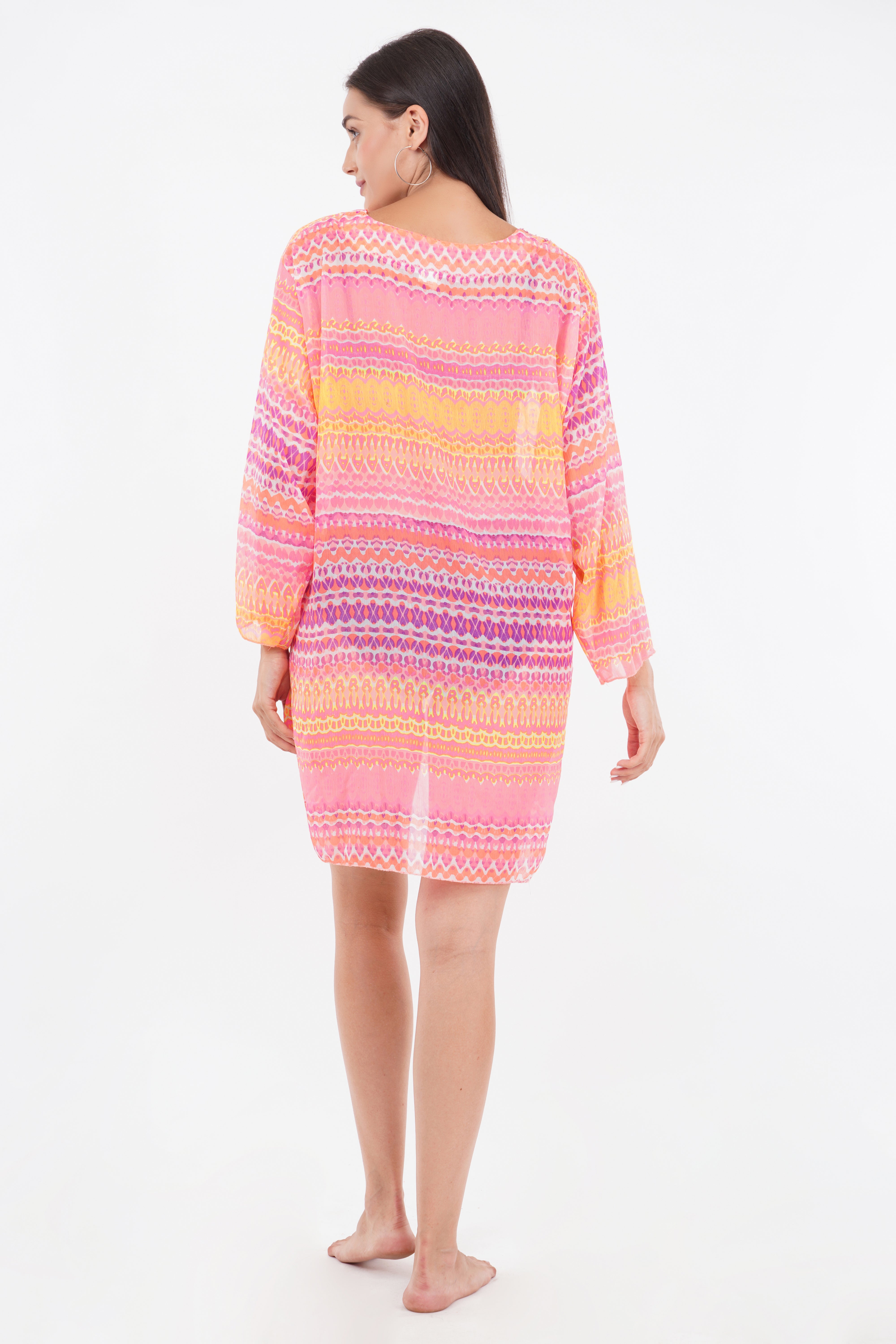 Turn heads with this sun-kissed style chic Neon pink Beach Throw Kurti—its delicate design and breezy fabric make it the perfect complement to your beach ensemble. This full-sleeve V-neck sensual Beach Throw Kurti is designed with a lightweight and breathable fabric that is suitable for beach or pool outings. This fabric is moisture-wicking, which helps absorb sweating fast and keeps you cool & comfortable always.