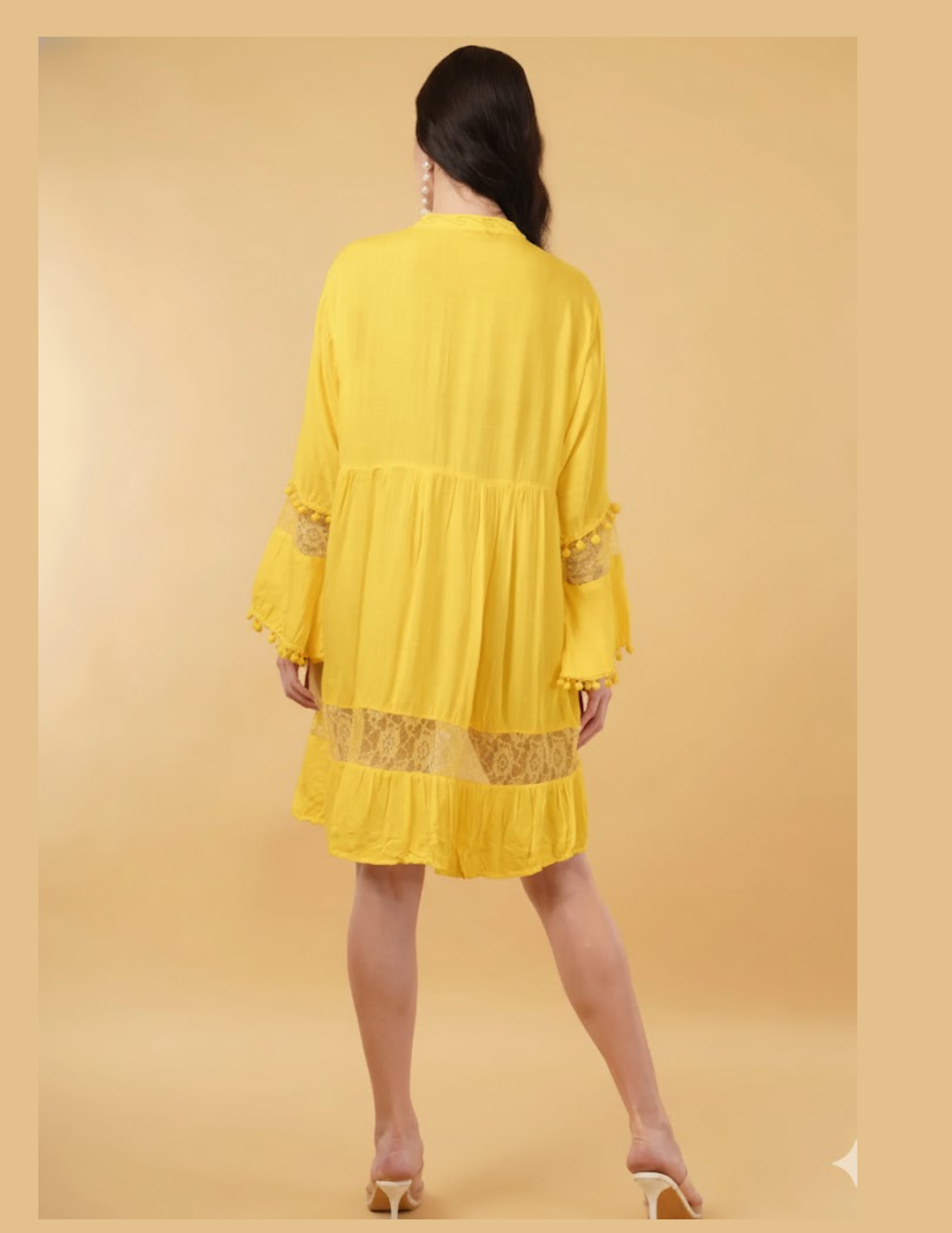Product Details: This short party dress featuring beautiful embroidery with net layer is a dazzling choice that effortlessly combines playful flair with sophisticated style. Featuring a series of cascading, voluminous layers, this dress creates a dramatic and dynamic silhouette that moves gracefully with every step. The flared layers add a whimsical touch, making it perfect for any event from lively celebrations to special occasions. Crafted from luxurious fabric this dress offers a refined, textured look that enhances its modern charm. The shorter length showcases the legs while the layers add a flattering, feminine touch.
