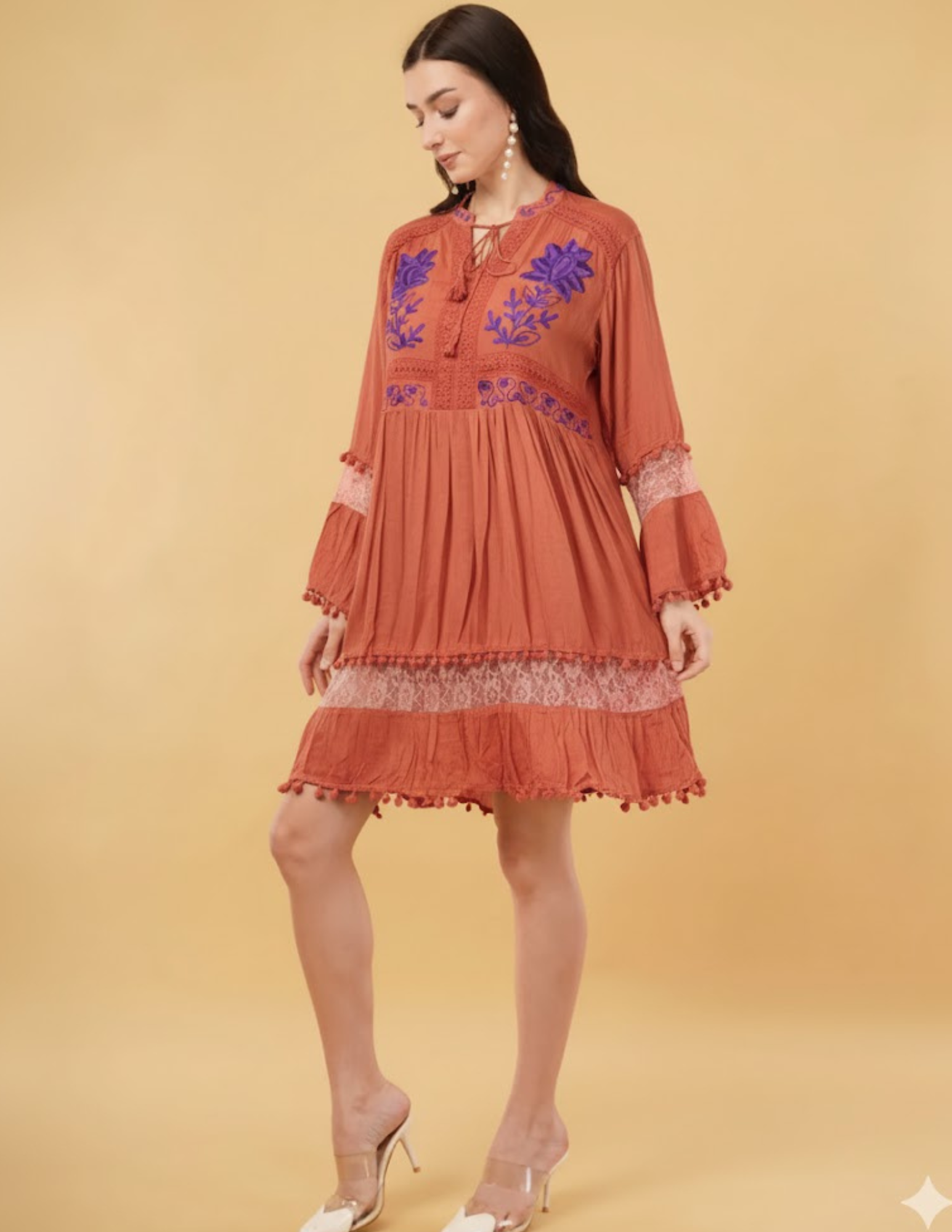 Liva Mocha Embroidered Floral Short Dress Relax Fit