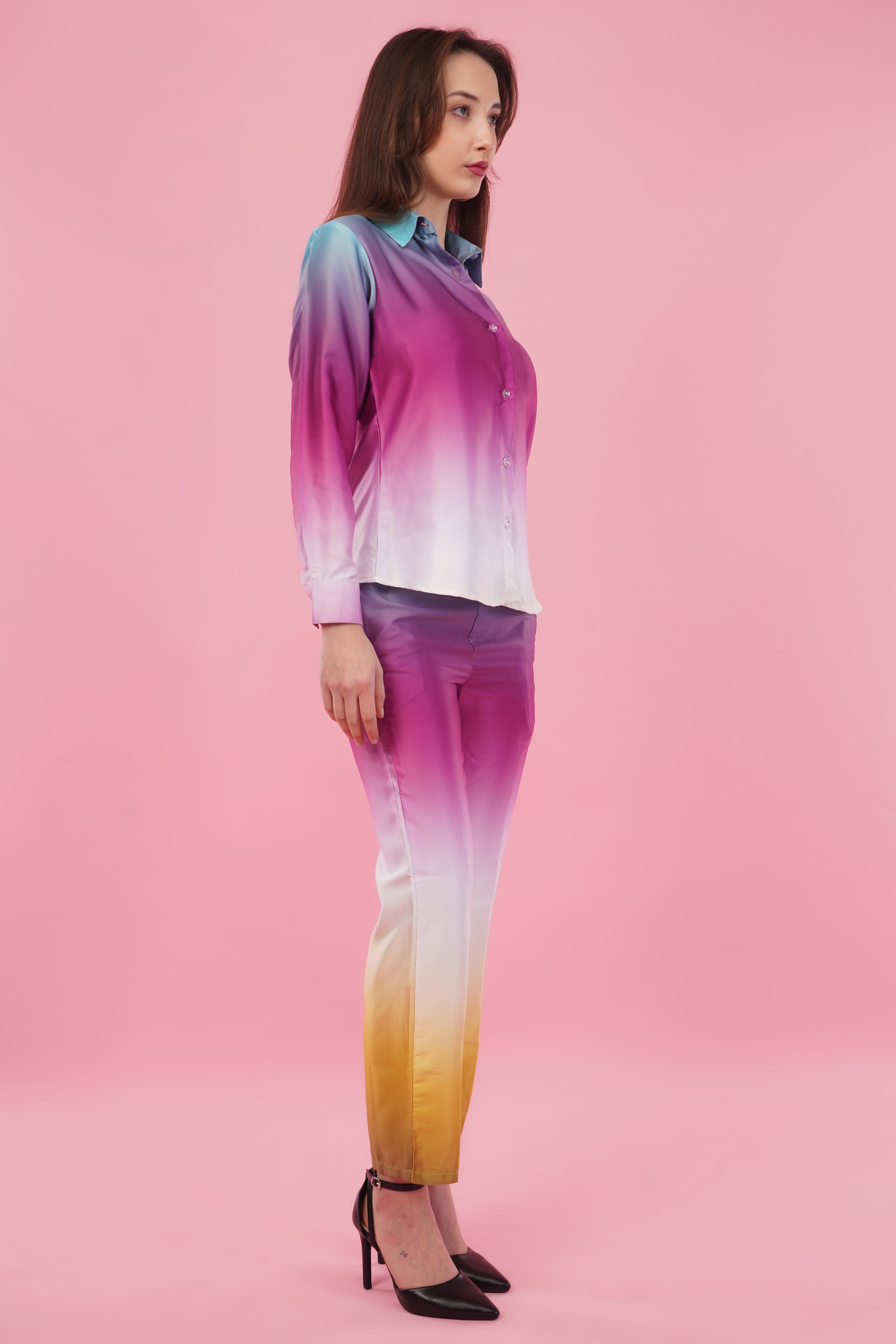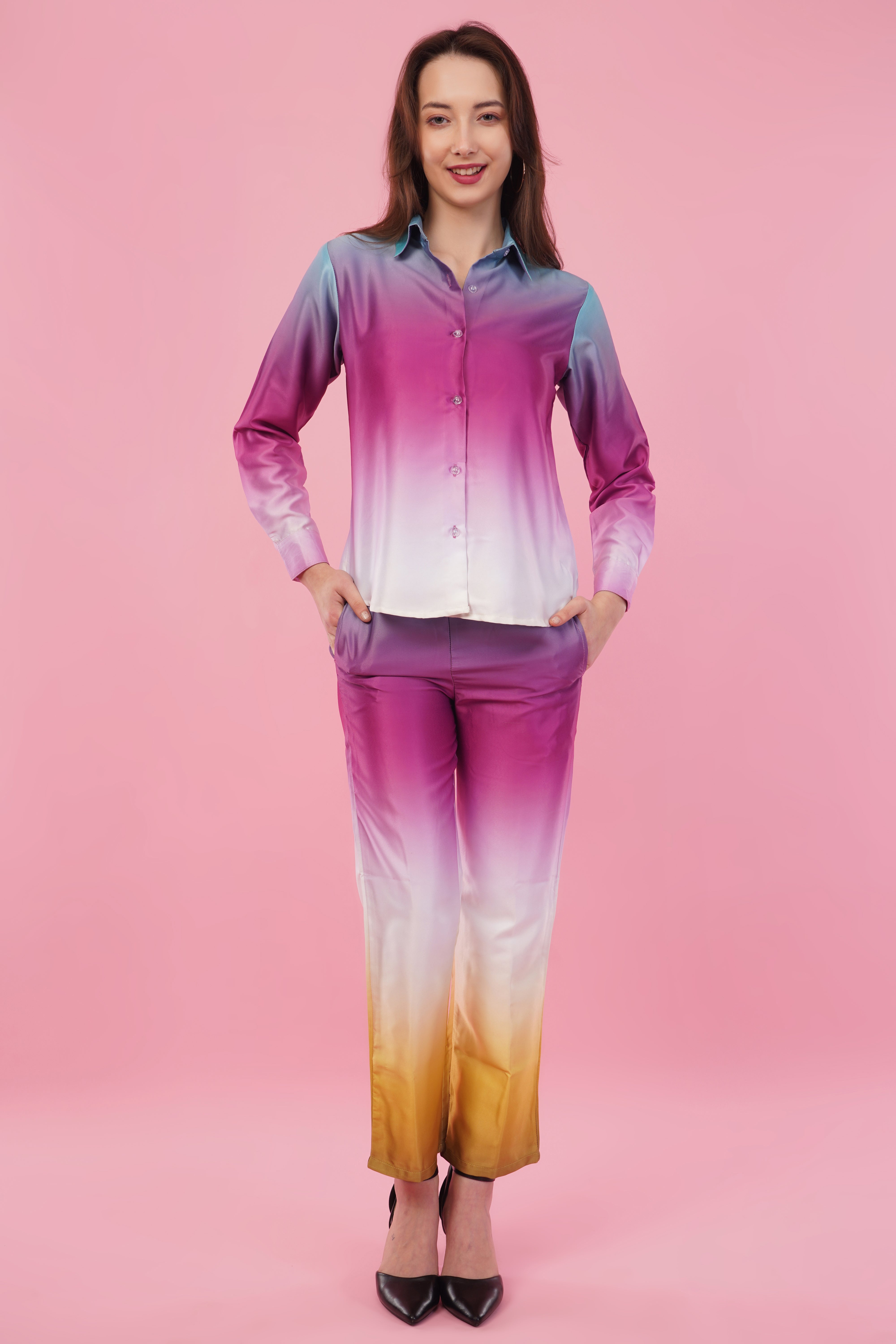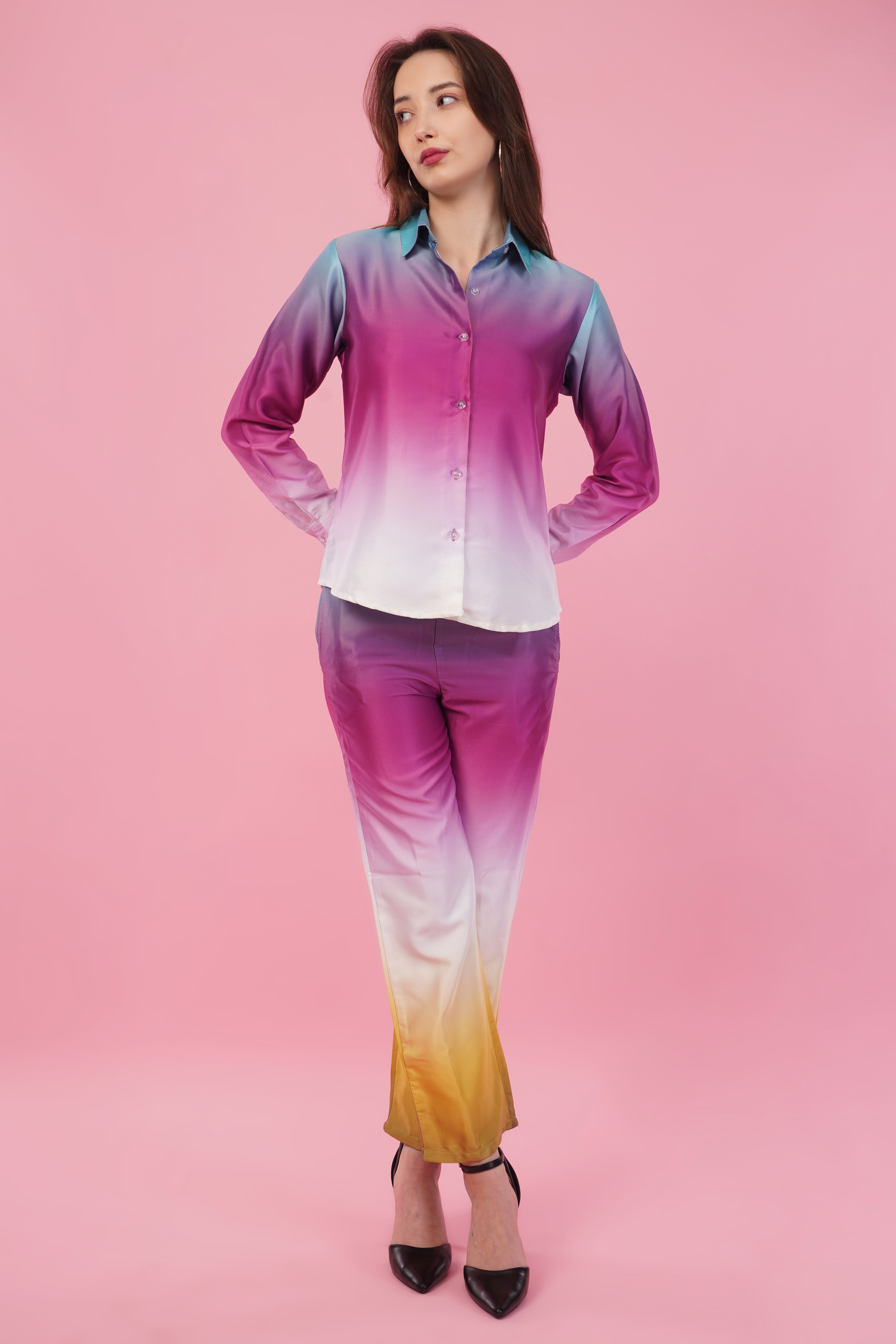 Elevate your style with this Ombre Shirt & Pant Co-Ord Set. This sophisticated ensemble is a perfect blend of sharp sophistication and laid-back cool. This set brings a fresh twist to classic formalwear with a modern ombre gradient that transitions beautifully from one color to the next. The shirt features a sleek button-down silhouette, with a smooth transition of colors that gives it a contemporary edge while maintaining a professional appearance. The matching pants are designed with a slim, flattering fit that complements the shirt, offering a sharp, put-together look. Ideal for business meetings, dinner events, or a polished evening out, this set ensures you’ll stand out in style without compromising on comfort. Whether worn together or as separate pieces, this Ombre Shirt & Pant Co-Ord Set adds a fresh twist to your wardrobe essentials.
