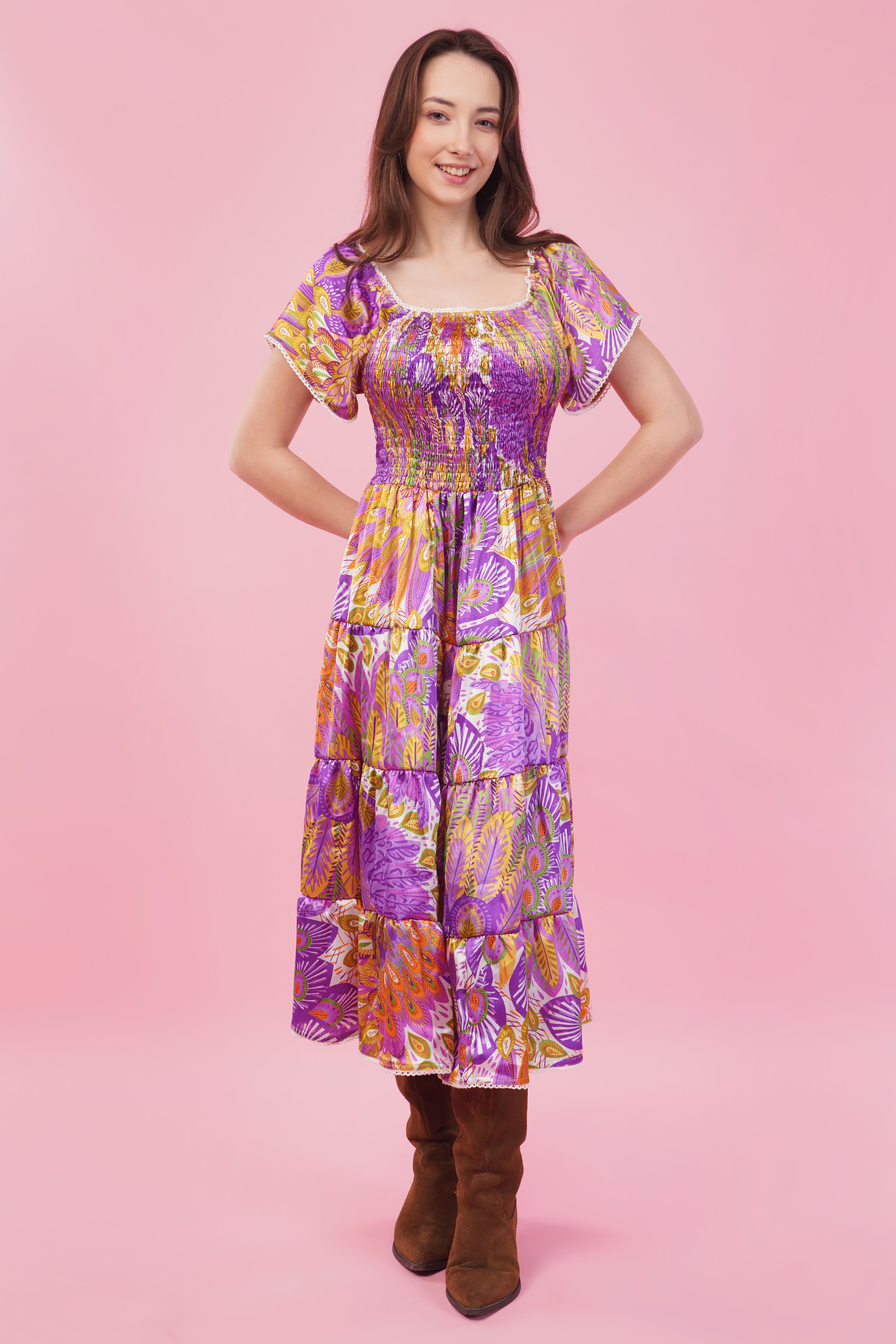 Turn heads with our effortlessly chic Smocked Flared Dress, where intricate smocking accentuates your curves and the flared, multi-tiered skirt brings a perfect blend of whimsy and elegance. Designed with delicate lacework and loose sleeves, this dress offers both comfort and style. Crafted from lightweight, breathable fabric, it’s ideal for lunch dates, dinner parties, beach outings, or poolside gatherings with friends. Make a bold statement by dropping the shoulders for a sultry, shoulderless look. Plus, the moisture-wicking fabric keeps you cool, dry, and comfortable, no matter the occasion.