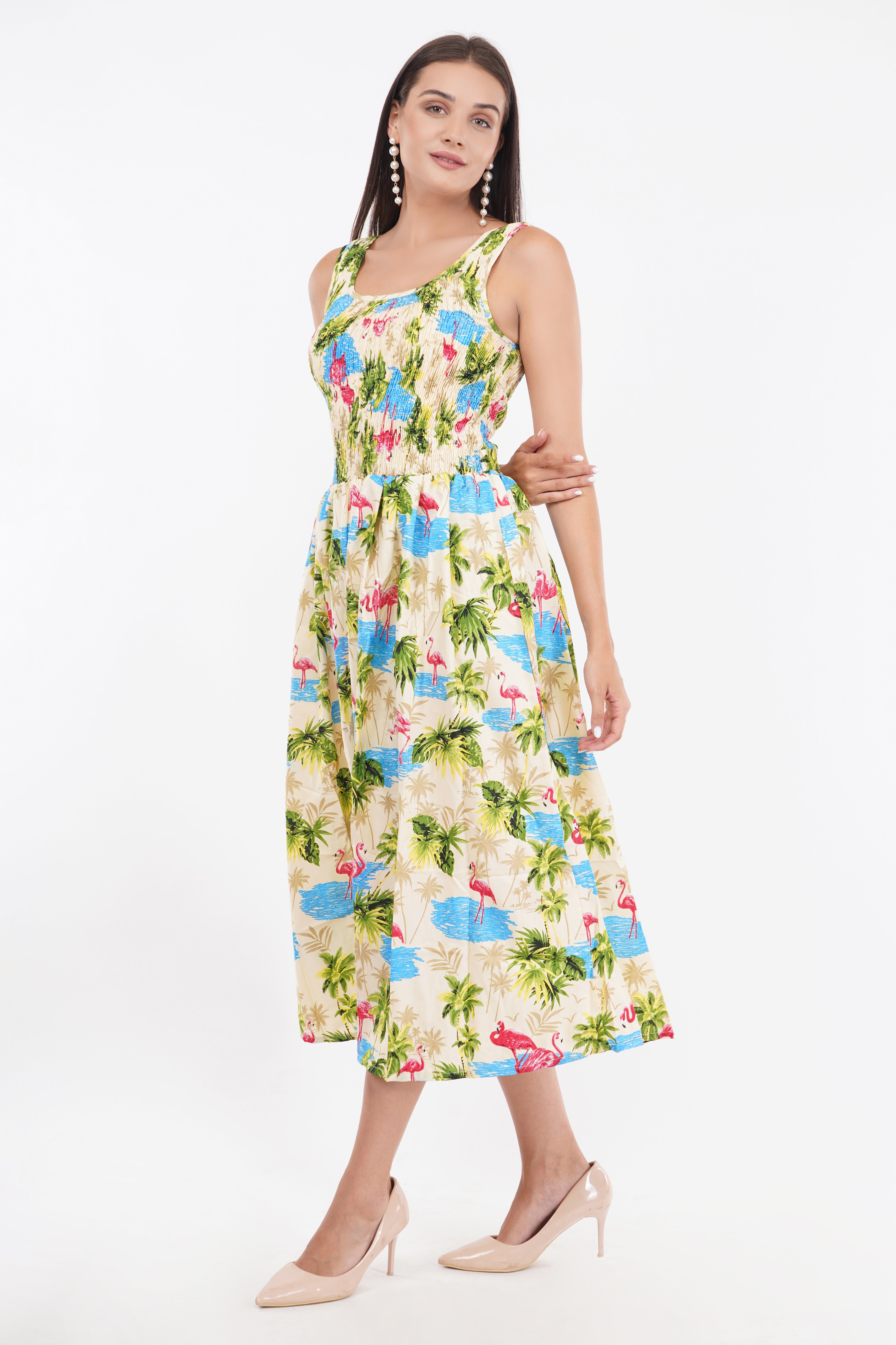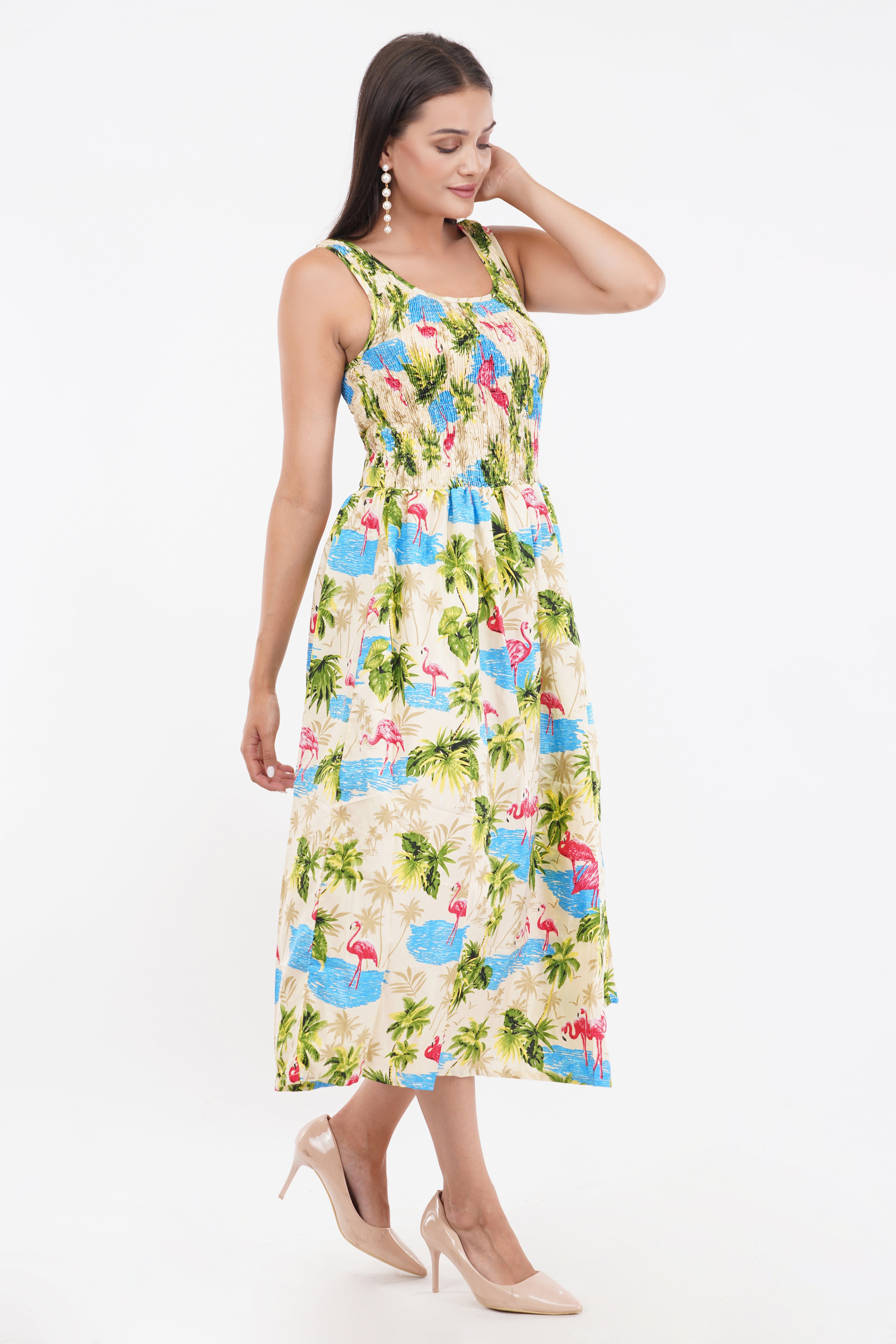 Tropical Flamingo Long Smocked Dress with Belt